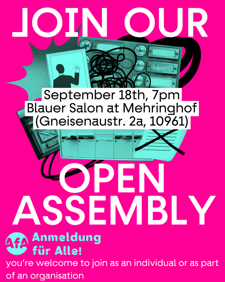 The more official supporters of the campaign appear with their logo on the posts and flyers, the more weight we can give to the demands. If you would like to sign the appeal with your organization, association or other collective or if you would like to work as part of the campaign, please send us an email to anmeldung-fuer-alle@riseup.net with the logo of the entity you represent.